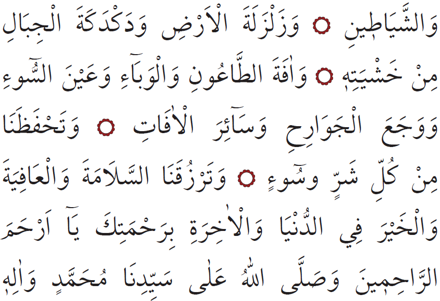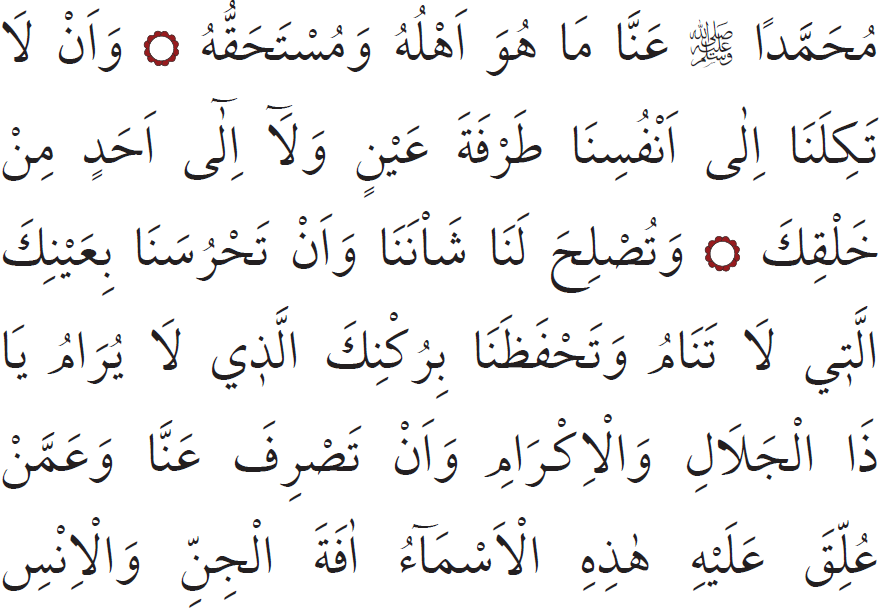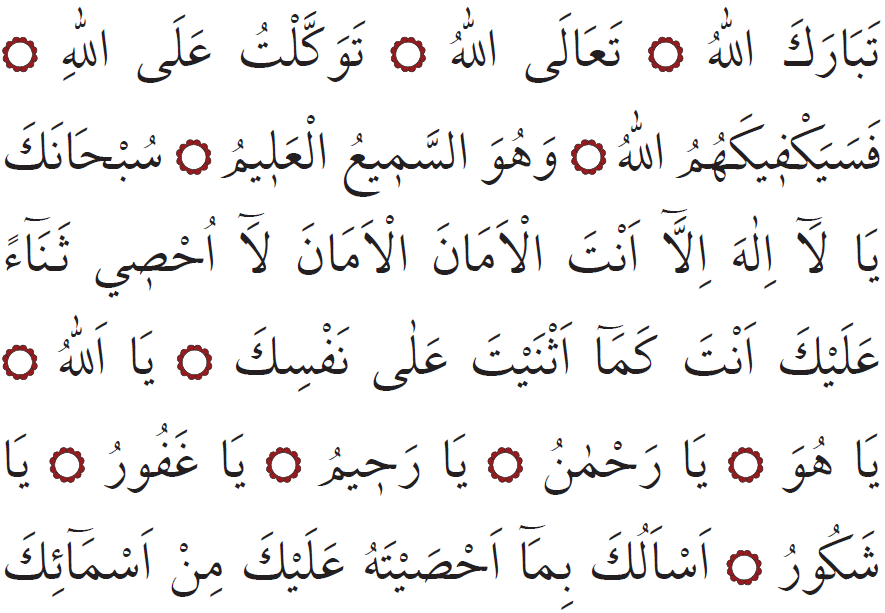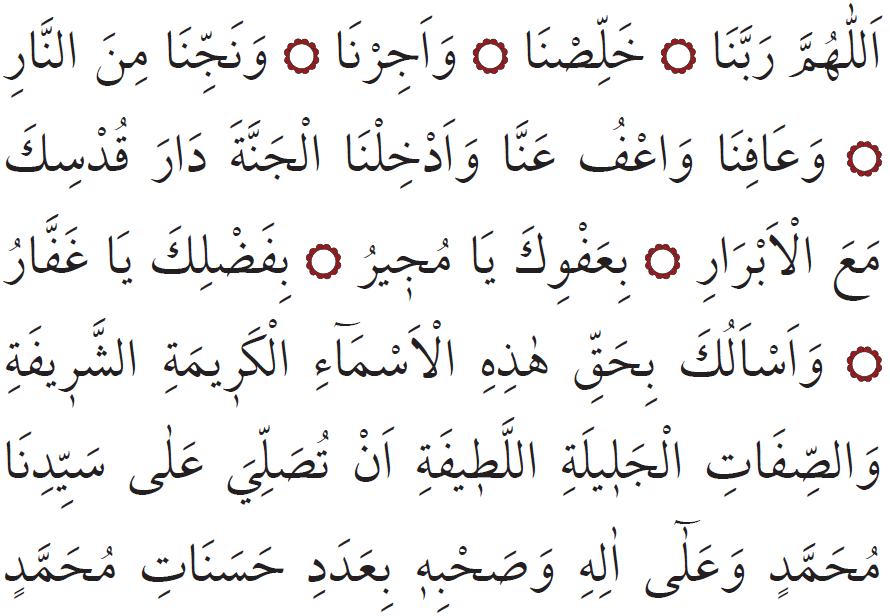 Eý Allam! Eý Rebbimiz! Bizi jähennemiň azabyndan halas et we medet ber! Eý gullaryny azapdan gorap, halas edýän we bagyşlaýan Rebbim! Merhemetiň we keremiň bilen bize saglyk we esenlik ber, bizi bagyşla, bizi ýagşylyk edenler bilen päk diýaryňa – Jennetiňe goý. Men, şu gadyrly we abraýly atlaryň, beýik sypatlaryň haky üçin, söýgüli Pygamberimize, onuň maşgalasyna we sahabalaryna, Onuň (s.a.w.) eden ýagşylyklary möçberinde salawat we merhemet indirmegiňi isleýärin we ýalbarýaryn! Allanyň ady bilen. Alla maňa ýeter. Alladan başga hakyky hudaý ýok, Alla hem ähli zada şaýatdyr. Diý: Ol Alladyr. Allanyň isläni bolar. Rebbim Alladyr. Allanyň abraýy beýikdir. Alla beýikdir. Alla töwekgel edip ynandym. Duşmanlara garşy Alla saňa ýeter. O ähli zady eşidýär we bilýär!