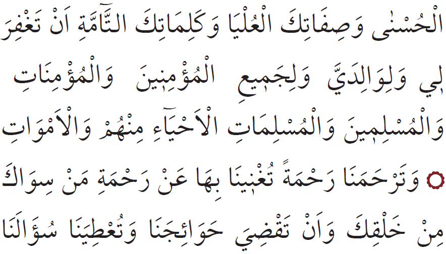 Eý Allam! Özüň hakynda agzaýan gözel atlaryň, beýik sypatlaryň we ähli sözleriň haky üçin Senden isleýärin we ýalbarýaryn; meni, ene-atamy, öli ýa-da diri, erkek ýa-da aýal ähli mömin we musulmanlary bagyşla!