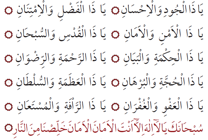 Sen ähli kemçilik we nogsanlardan päksiň, Senden başga bizi halas etjek hudaý ýok ahyryn! Bize amanlyk ber, amanlyk dileýäris. Bizi jähennem odundan halas et! (15)