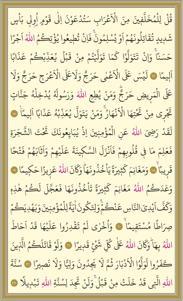 16. Sen ol (söweşe gatnaşman yzda galan) çarwalara: «Siz tiz wagtda örän güýçli we ýowuz (söweşjeň) bir kowuma garşy (söweşe) çagyrylarsyňyz. (Ýa) siz olara garşy (soňuna çenli) söweşersiňiz, ýa-da olar (uruşsyz) musulman bolarlar. Eger siz (bu gezek emre) tabyn bolsaňyz, Alla size ajaýyp sylag berer. Emma siz, mundan öň hem ýüz öwrüşiňiz ýaly, (ýene-de) ýüz öwrüp (söweşden gaçsaňyz), size jebir-jepaly azap bilen jeza bereris» diýip aýt.