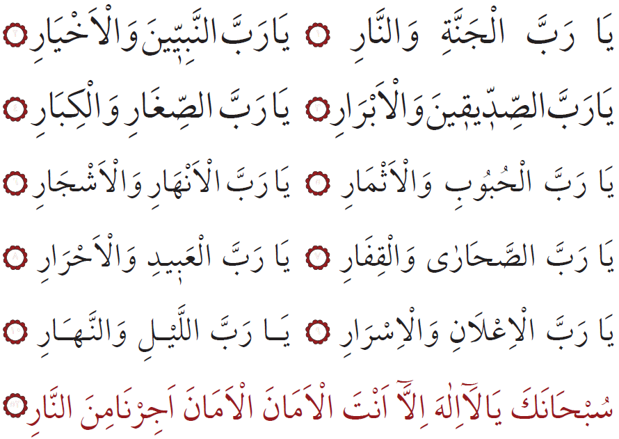 Sen ähli kemçilik we nogsanlardan päksiň, Senden başga bizi halas etjek hudaý ýok ahyryn! Bize amanlyk ber, amanlyk dileýäris. Bizi jähennem odundan halas et! (53)