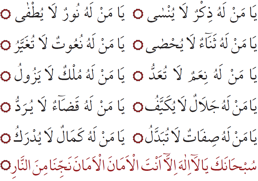 Sen ähli kemçilik we nogsanlardan päksiň, Senden başga bizi halas etjek hudaý ýok ahyryn! Bize amanlyk ber, amanlyk dileýäris. Bizi jähennem odundan halas et! (70)
