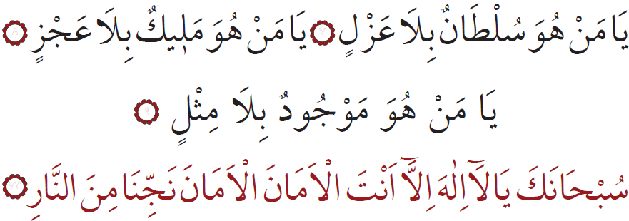 Sen ähli kemçilik we nogsanlardan päksiň, Senden başga bizi halas etjek hudaý ýok ahyryn! Bize amanlyk ber, amanlyk dileýäris. Bizi jähennem odundan halas et! (73)
