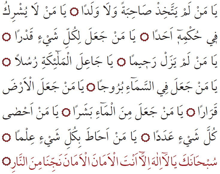 Sen ähli kemçilik we nogsanlardan päksiň, Senden başga bizi halas etjek hudaý ýok ahyryn! Bize amanlyk ber, amanlyk dileýäris. Bizi jähennem odundan halas et! (83)