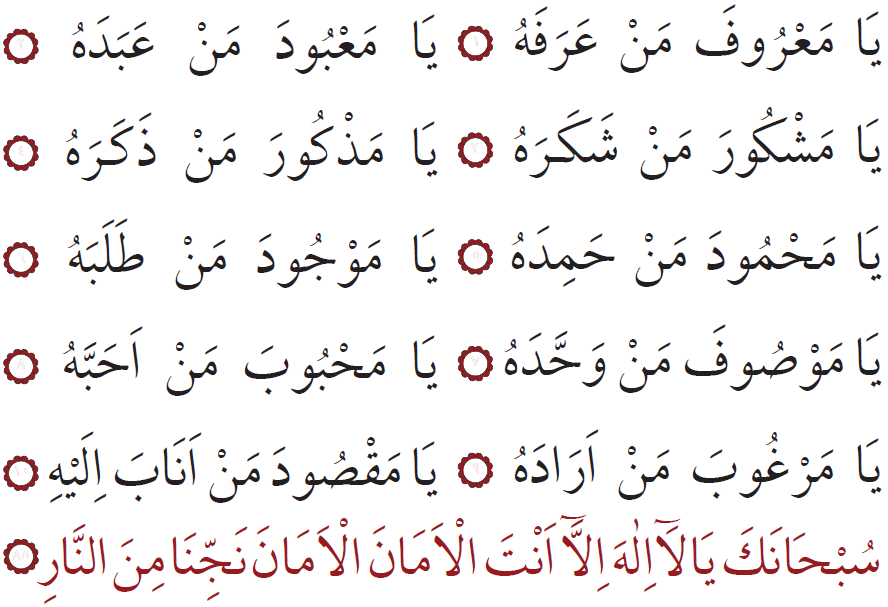 Sen ähli kemçilik we nogsanlardan päksiň, Senden başga bizi halas etjek hudaý ýok ahyryn! Bize amanlyk ber, amanlyk dileýäris. Bizi jähennem odundan halas et! (85)