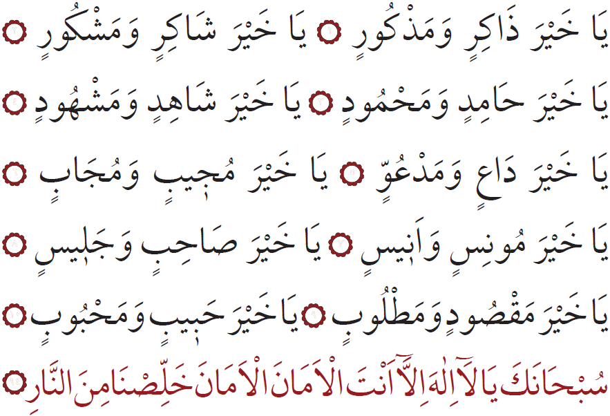 Sen ähli kemçilik we nogsanlardan päksiň, Senden başga bizi halas etjek hudaý ýok ahyryn! Bize amanlyk ber, amanlyk dileýäris. Bizi jähennem odundan halas et! (94)