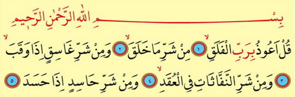 Kul e’uzü birabbil-felak. Min şerri mä halak. We min şerri gasikyn izä wekab. We min şerrinneffasati fil’ukad. We min şerri hasidin izä hased.