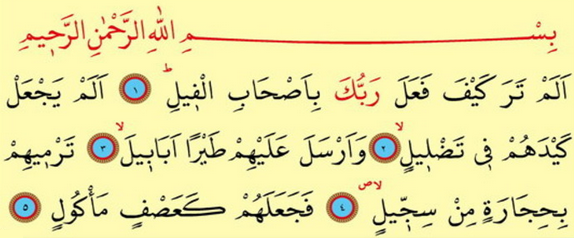Elem tera keýfe fe'ale rabbüke bi-ashabil-fiýl. Elem ýej'al keýdehüm fiý tadliýl. We ersele aleýhim taýran ebabil. Termihim bi-hijaratin min sijjil. Feje'alehüm ke'asfin me'kül.