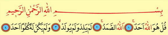 Aýt (eý, Muhammet!): «Ol Alla Ahatdyr (Birdir). Alla Sametdir (hiç zada mätäç däldir, ähli zat Oňa mätäçdir). Ol (hiç kimi) dogran däldir, (hiç kimden) doglan däldir. Onuň hiç bir deňi-taýy ýokdur».