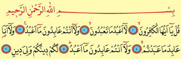 Aýt! (eý, Muhammet!): «Eý, kapyrlar! Men siziň ybadat edýäniňize ybadat etmeýärin!