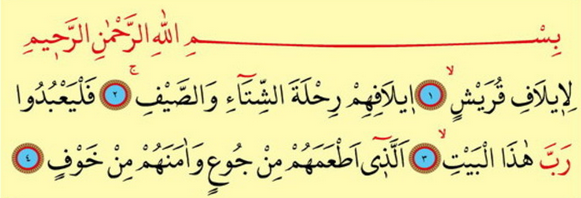 Kuraýşlylar özleriniň ülpet bolup jebisleşendikleri, özlerine gyşda we tomusda sapar etmegiň aňsat edilip goýlandygy, özlerini açlykdan doýrandygy we gorky-howpdan asuda edendigi üçin bu öýüň (Käbäniň) Perwerdigärine ybadat etsinler!