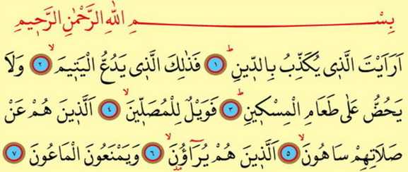 Era’eýtelleziý ýükezzibü biddin. Fezälikelleziý, yedu’ulyetim. Welä yehüddü alä ta’amilmiskin. Feweýlün lilmüsalliýn. Elleziýnehüm an salätihim sahun. Elleziýne hüm ýüraune. we ýemne’unelma’un.