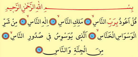Aýt (eý, Muhammet!): «Men ynsanlaryň Perwerdigärine, ynsanlaryň Hökümdaryna, ynsanlaryň Hudaýyna sygnyp, (gaflatda wagty) ynsanlaryň gursaklaryna (ýüreklerine) was-wasy salýan, (Allany ýatlaýan wagty bolsa gaçýan) ynsanlardan we jynlardan bolan şeýtanyň şerinden pena isleýärin!».