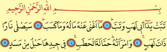 Tebbet ýedä ebiý lehebin ve tebb. Mä egnä anhü mälühu we mä keseb. Seyeslä nären zate leheb. Wemraetühu hammaletel-hatab. Fiý jiý-dihä hablün min mesed.