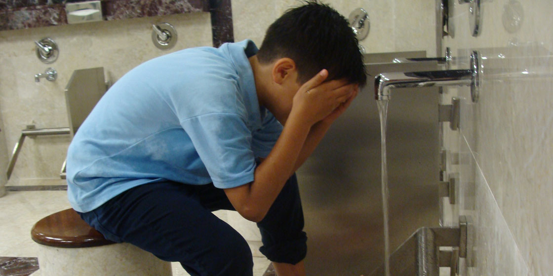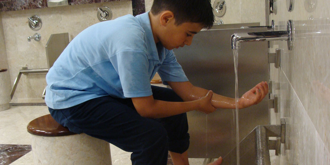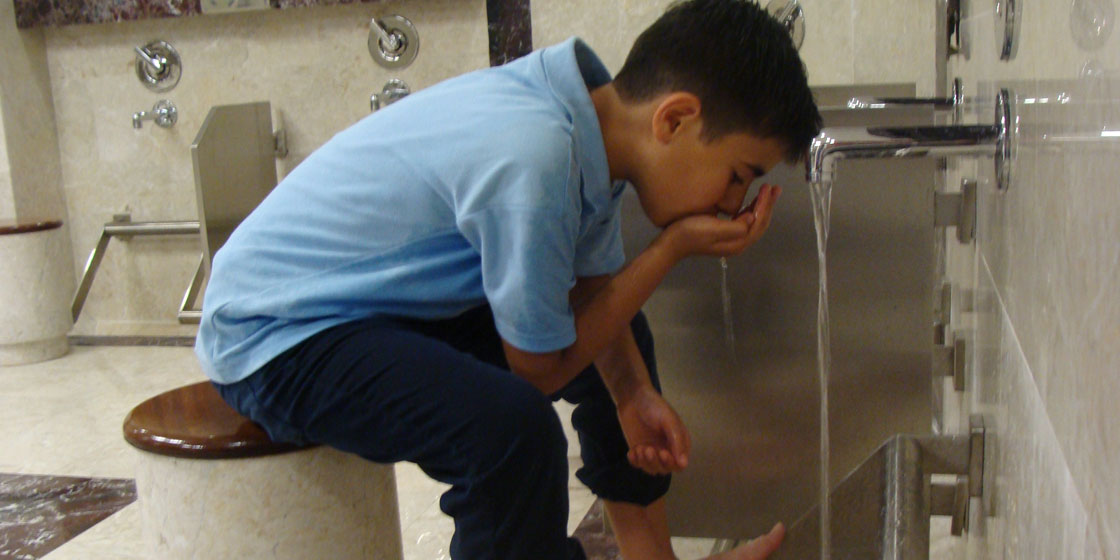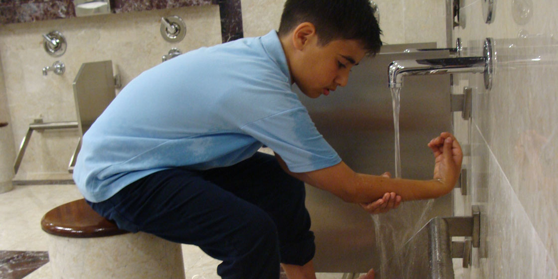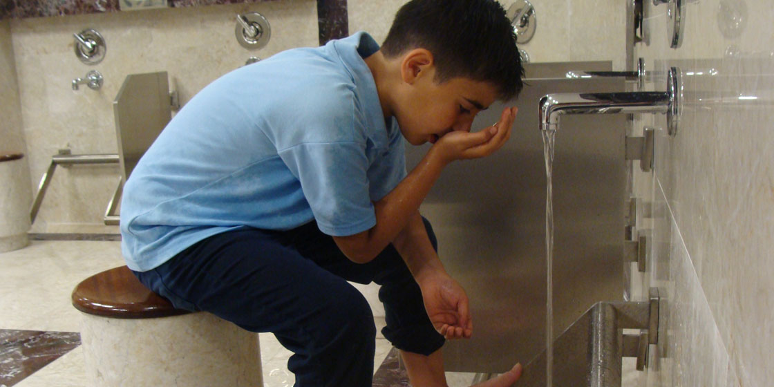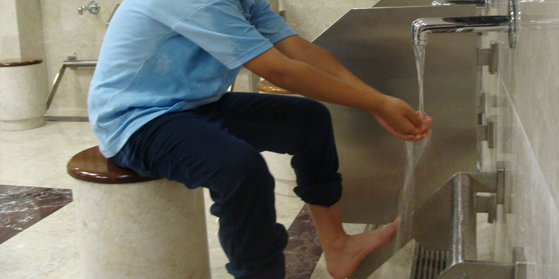 Eller bileklere çenli üç gezek ýuwulýar. Barmak aralarynyň hem ýuwulmagyna dykgat etmeli. Barmakda ýüzük bar bolsa arasyna suw geçirmeli.