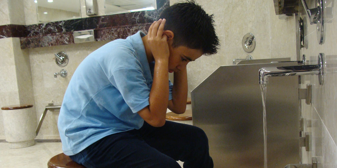 Elleri ölläp sag eliň süýem barmagy bilen sag gulagyň içini, başam barmagy bilenem daşyny; çep eliň süýem barmagy bilen çep gulagyň içini, başam barmagy bilenem daşyny mesilemeli.