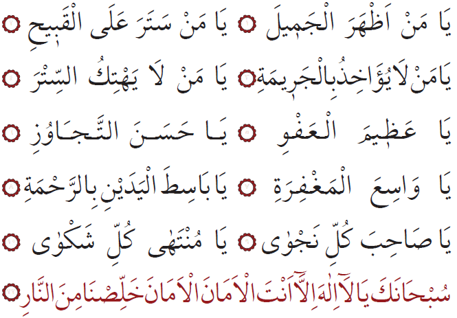 Sen ähli kemçilik we nogsanlardan päksiň, Senden başga bizi halas etjek hudaý ýok ahyryn! Bize amanlyk ber, amanlyk dileýäris. Bizi jähennem odundan halas et! (22)