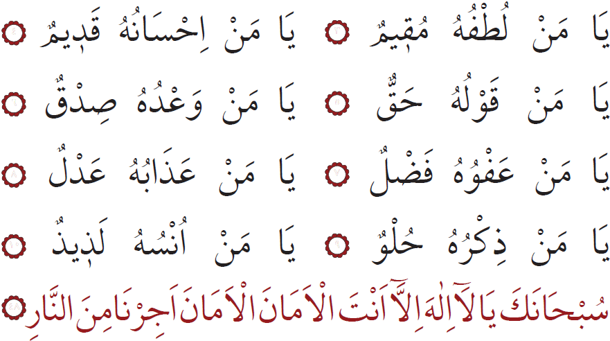 Sen ähli kemçilik we nogsanlardan päksiň, Senden başga bizi halas etjek hudaý ýok ahyryn! Bize amanlyk ber, amanlyk dileýäris. Bizi jähennem odundan halas et! (48)