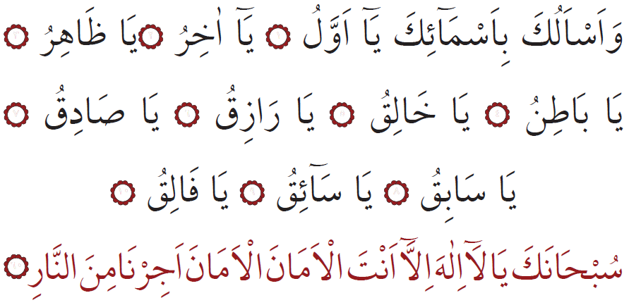 Sen ähli kemçilik we nogsanlardan päksiň, Senden başga bizi halas etjek hudaý ýok ahyryn! Bize amanlyk ber, amanlyk dileýäris. Bizi jähennem odundan halas et! (60)