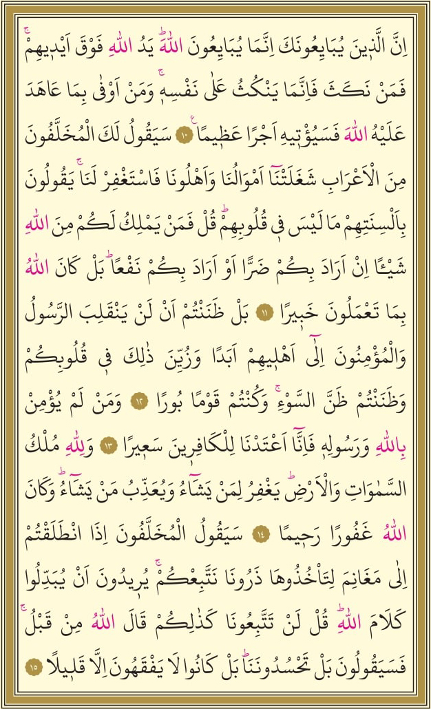 10. Takyk, saňa söz (äht) berenler, aslynda, Alla söz (ykrar) berendirler. Allanyň eli (gudraty) olaryň (äht edenleriň) elleriniň (güýçleriniň) ýokarsyndadyr. Kim (öz) beren sözünden dänse, takyk, ol öz garşysyna däner. Emma kim Alla beren sözüne wepaly bolsa, Alla oňa uly sylag berer.