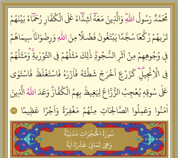 29. Muhammet Allanyň ilçisidir. Onuň ýanyndaky (möminler) bolsa kapyrlara ýowuz, öz aralarynda bolsa (biri-birlerine) rehimlidirler. Sen olaryň, Allanyň pazlykeremini we razylygyny isläp, rukug we sežde edýändiklerini görersiň. Olaryň ýüzlerinde (maňlaýlarynda) sežde yzyndan (galan) alamat-nyşan bardyr. Bu olaryň Töwratdaky (beýan edilen) aýratynlyklarydyr. Olaryň Injildäki (beýan edilen) aýratynlyklary bolsa gögerip, gitdigiçe güýçlenip ýognaýan we öz göwresine daýanýan bir ekin (ösümlik) mysalydyr. (Bu ekin) daýhanlaryň göwnüne ýarandyr. Bu (Allanyň şeýdip, şu ekin ýaly musulmanlary köpeldip, güýçlendirmek bilen) kapyrlaryň (has hem) gaharyny getirmek üçindir. Alla iman getirip, ýagşy işleri edýänlere ýalkaw hem-de uly sylag wada berýär.